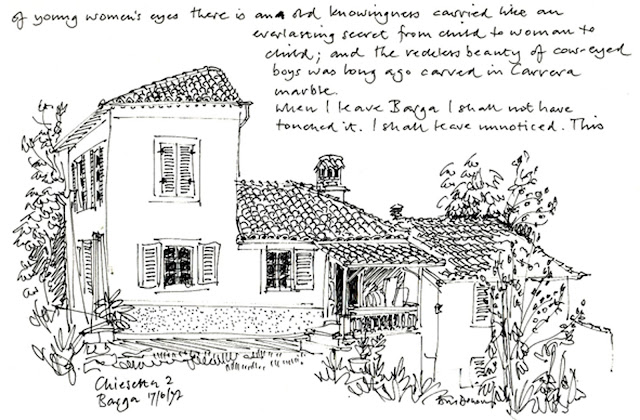 Having done a watercolour of the house from beside the piscina, I quickly did this pen sketch because, hearing some falcons mewing in the sky above me, I was inspired to write a lyrical, illustrated article.