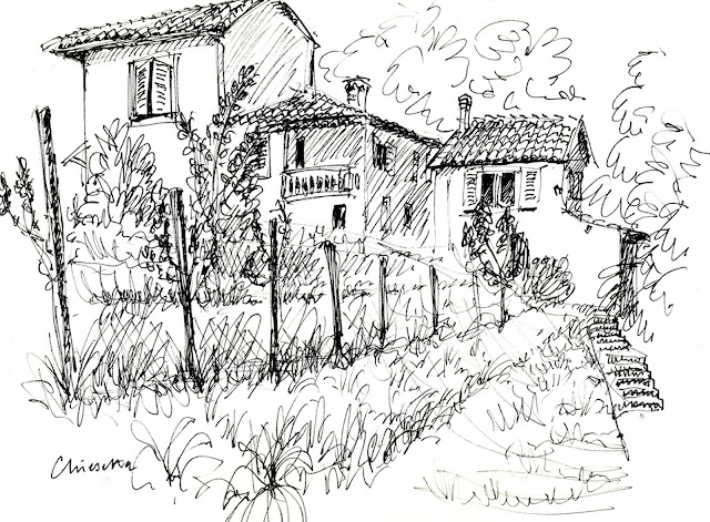 I sketched it a number of times (more in later posts) but this rendering, done from below the slopes where olives, vines and raspberries grow, shows the whole, two-part casa. The main house is to the left. The smaller house was once used for animals but has been converted into living accommodation.